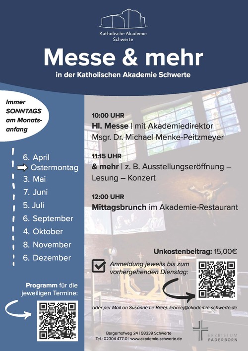 Am 03. Mai 2026 lädt die Katholische Akademie Schwerte herzlich zum zweiten Mal zu Messe & mehr ein. Gemeinsam mit Akademiedirektor Msgr. Dr. Michel Menke-Peitzmeyer feiern wir die Sonntagsmesse. Im Anschluss ist der Konzertakkordeonist Dr. Maik Hester zu Gast. Als promovierter Musikwissenschaftler, lebt und arbeitet er freischaffend in Witten und ist künstlerischer Lehrbeauftragter an der TU Dortmund für Akkordeon, Klavier und Musiktheorie und leitet dort auch das Ensemble für Neue Kammermusik.
