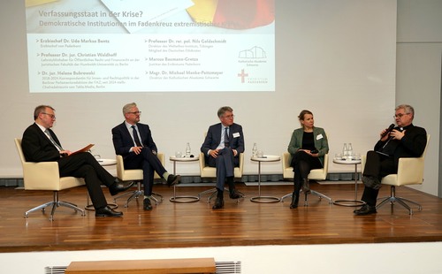 Schwerte / Paderborn (pdp). »Es braucht Menschen, die für dieses Thema brennen, die Solidarität und persönliches Engagement zeigen«, betonte Erzbischof Dr. Udo Markus Bentz mit Blick auf den jüdisch-christlichen Dialog, insbesondere auch als Thema im Schulunterricht. Der Paderborner Erzbischof nahm am Mittwochabend (04.02.2026) in der Katholischen Akademie Schwerte an einer Podiumsdiskussion zur Zukunft des jüdisch-christlichen Dialogs teil. Diese fand im Rahmen der zweitägigen Jahrestagung der Vereinigung katholischer Religionslehrerinnen und -lehrer an Gymnasien und Gesamtschulen im Erzbistum Paderborn (VKRG) in Kooperation mit der Katholischen Akademie Schwerte, dem Institut für Lehrerfortbildung Essen (IfL) und der Abteilung Religionspädagogik im Bereich Schule und Hochschule im Erzbischöflichen Generalvikariat Paderborn statt.